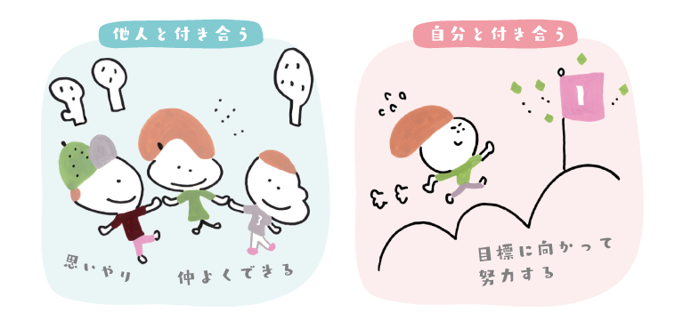 たとえば、他人と付き合うときは、ともだちと仲よくできたり、泣いている子に寄りそってあげたり。自分と付き合うときは、自分で目標を決めてがんばれたり、「こんなにがんばったんだから大丈夫だよ!」と自分に自信を与えるような強い気持ちがもてたり。