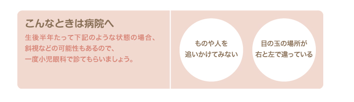 3~4ヵ月になると、人の顔やおもちゃを目で追ってみる「追視」をするようになり、半年を過ぎると急速に視力は発達。