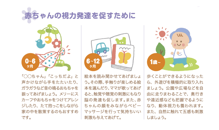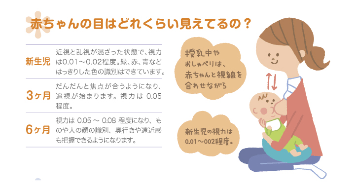 赤ちゃんの視力は、脳の発達にもつながっています。日頃から積極的に声をかけながら、いろいろな物を見せたり触れさせて、五感を刺激してあげましょう
