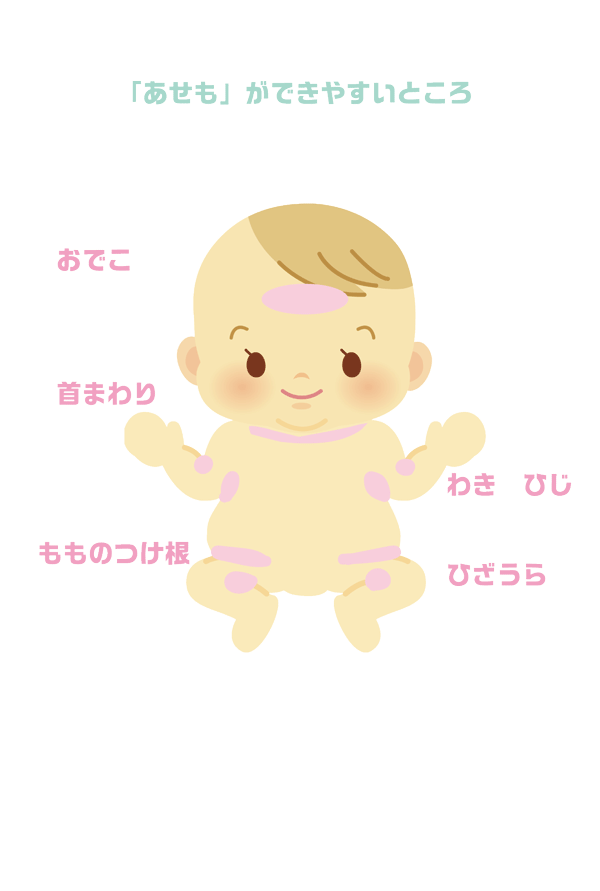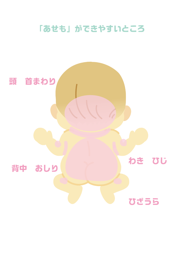 がおもな場所です。もちろんこれ以外にも、汗をたくさんかくところにあせもが現れます。