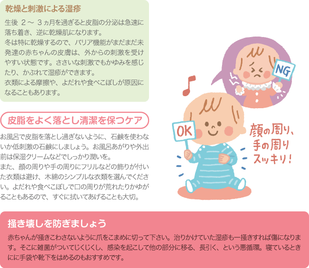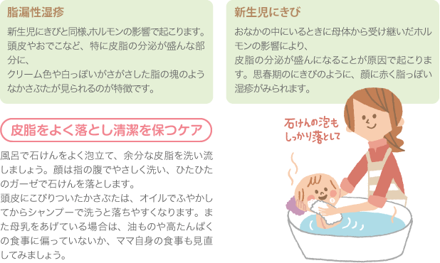 0歳の赤ちゃんの身体や顔にできる湿疹を『乳児湿疹』といいます。乳児湿疹には、新生児にきびや脂漏性湿疹、乾燥や汗などによってできる湿疹などがあり、赤ちゃんの月齢や季節によって現れる症状もさまざまです。基本的には、症状に合わせて自宅で正しいケアを続けていれば自然と良くなります。ただ、じくじくしていたり、かゆみの強い湿疹である場合やスキンケアを続けても改善しないときには、かかりつけの専門医に診てもらいましょう。乳児性湿疹は、皮膚の未発達が原因でおこります。これも清潔と保湿が重要。そして、こすらず、刺激しないようにしましょう。