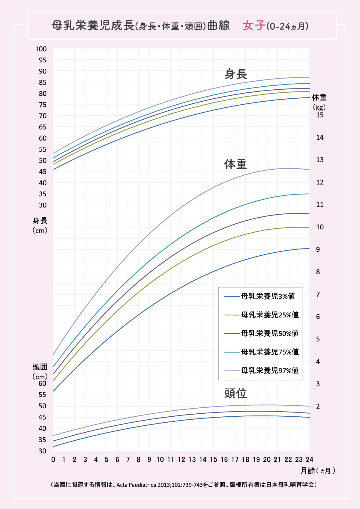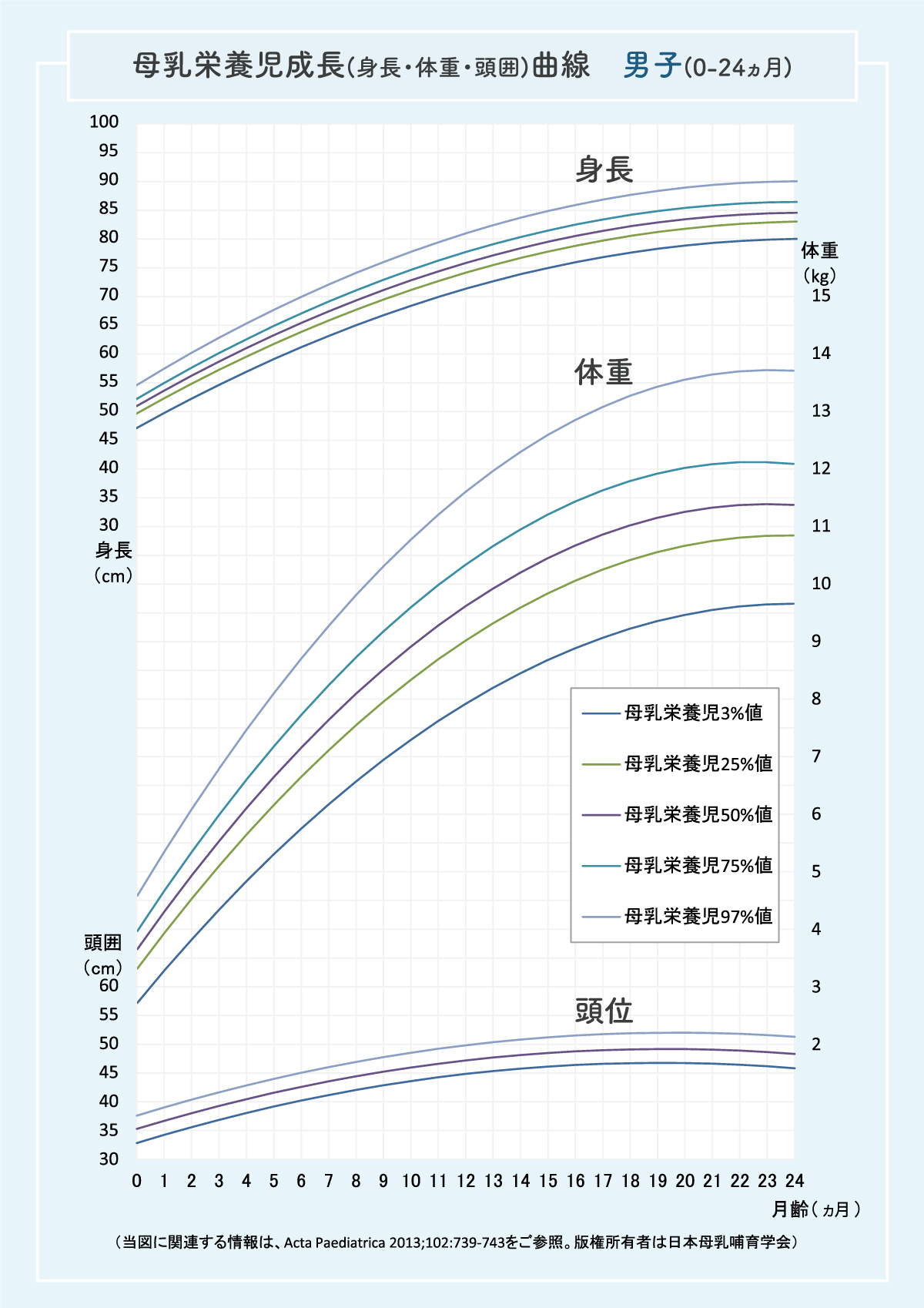 母子健康手帳に描かれている成長曲線は、厚生労働省の調査によるものです。このグラフには、母乳育児の赤ちゃんだけでなく、ミルクだけの赤ちゃん、母乳とミルクの混合の赤ちゃんと、さまざまなタイプの赤ちゃんが含まれています。