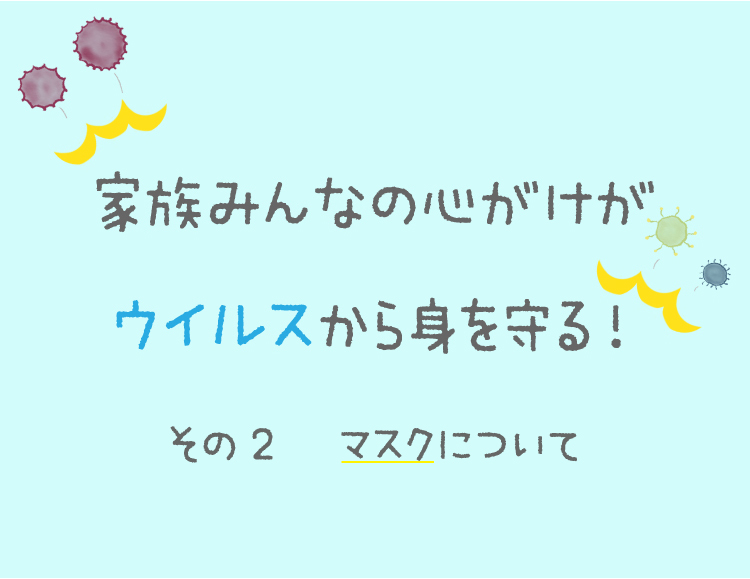 「家族みんなの心がけがウイルスから身を守る!②マスクについて」では、マスクの本来の役割、感染リスクを下げる正しいつけ方など、着用する際に気をつけておきたいポイントをご紹介しました。