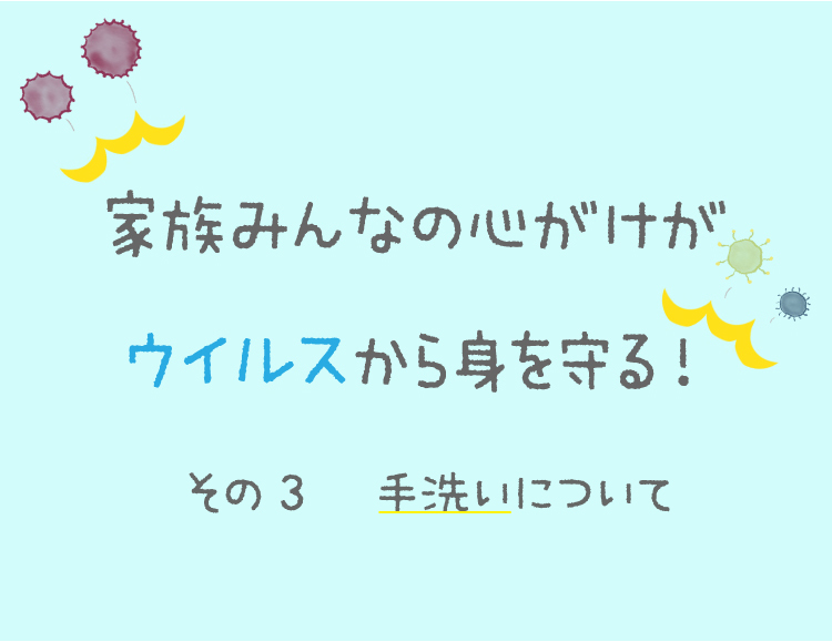 ウイルスなどの病原体の多くは、私たちの手にくっついて体内に侵入してきます。食事の前、外出先からの帰宅時、赤ちゃんのお世話の際などに“手洗い”をしっかり行うことが感染症予防には大切です。家族みんなで正しい手洗いを心がけて、ウイルスから身を守りましょう。