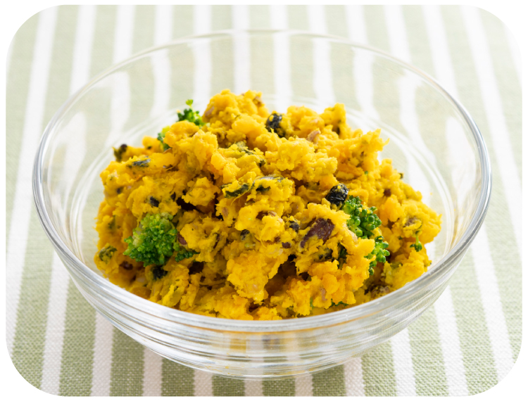 ① レンジ蒸し対応容器にかぼちゃ、ブロッコリーを入れて、600Wの電子レンジで4分加熱する。かぼちゃは粗めにつぶし、ブロッコリーは食べやすい大きさに手でちぎる。