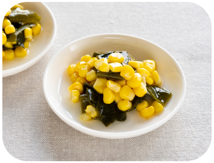 コーンの汁けを有効活用してわかめを戻す、びっくりアイデア! 海藻類と酢はとても相性がよく、酢によってわかめの食物繊維がやわらかくなり、吸収率が上がるんです。ちょい足しアレンジとして、ツナを1缶分、汁ごと加えるとよりおいしくなる上に、DHAやEPAといった質のよい脂が摂取できます。お好きなドレッシングやマヨネーズで和えてもおいしいですよ♪