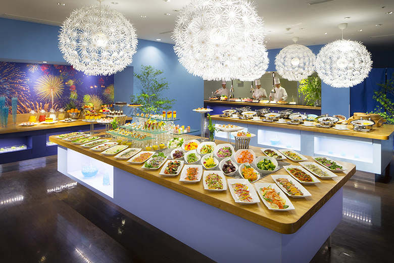 ブルーが基調のシックで素敵な内装のビュッフェは、中に入ってみるととても活気があり、子連れでも他の宿泊者の方に迷惑がかかってしまわないかと、心配せずに入れる環境でした♪ ベビーカーでもすいすい入っていけるほど広々としたフロアで、テーブル間隔もお隣さんを気にする必要がないくらいゆとりがあったのもよかったです。