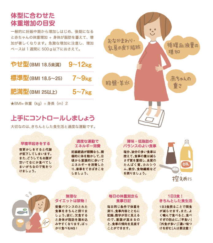 しかし、胎内で赤ちゃんを健やかに育て、お産にむけた体力作りのためにも適度な体重増加は必要。