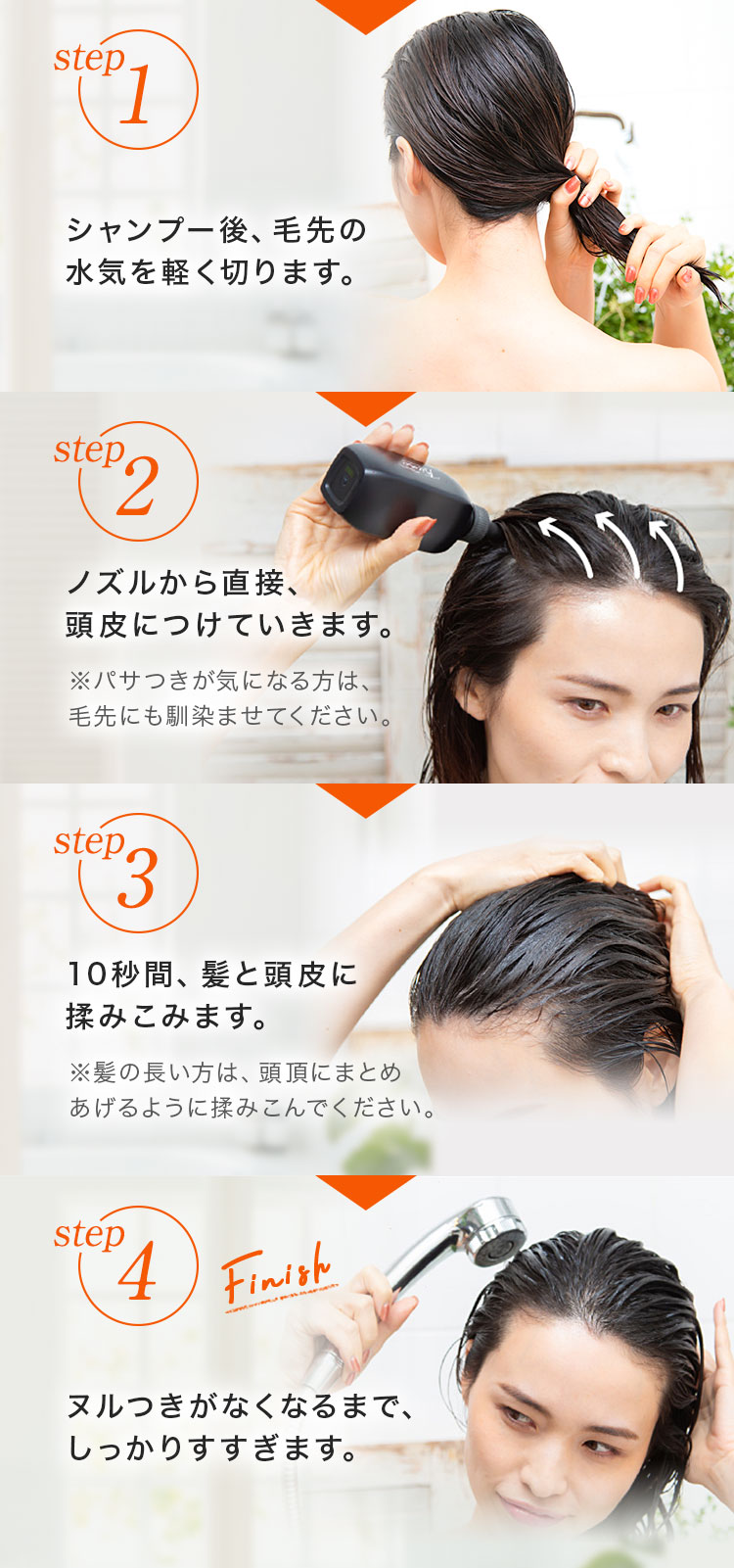 最初はサラサラとした液体なので、髪の毛や頭皮全体にトリートメントが一気に広がっていきます。