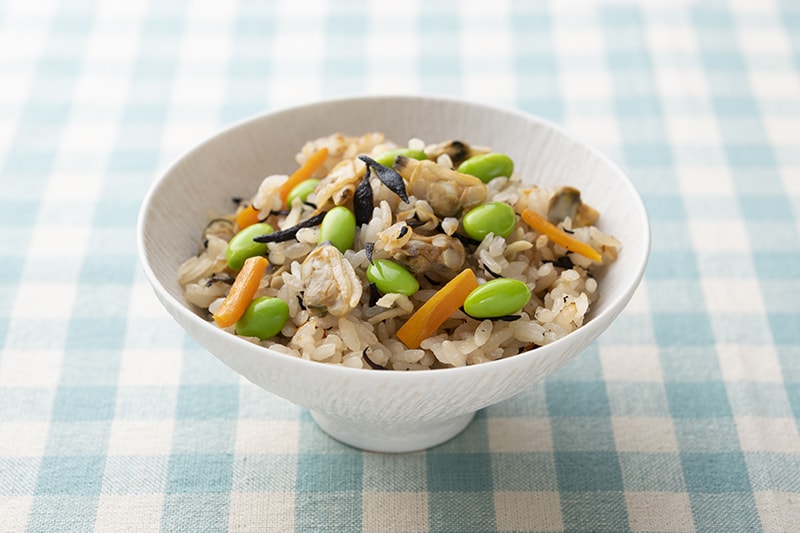 鉄分たっぷりなあさりは、水煮缶で手軽においしく摂取しましょう。葉酸が豊富な枝豆もプラスして、栄養満点で彩りのよい主食のできあがり!