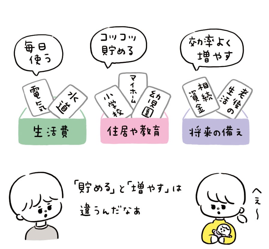 生活費は毎日必要なのですぐに使うお金、住居や教育費は確実に準備したいのでコツコツ貯めたいですよね。毎月の収入から貯めたい分を引き落とすと、残りのお金で生活をするので将来のお金が貯まりません。投資信託や変額保険など、手段はさまざまですがお金を”増やす”という考え方もあるんです。