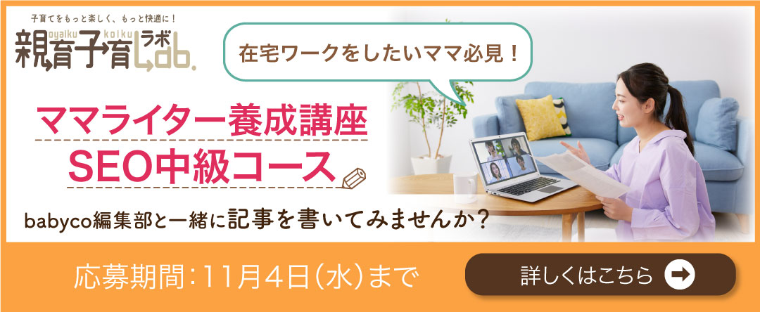 そんながんばるママたちに向けて、『ママライター養成講座~SEO中級コース』を実施します!Web記事を書くスキルとして必要なライティングの基礎知識を習得できます。ぜひ、babyco編集部といっしょに記事を書いてみませんか?