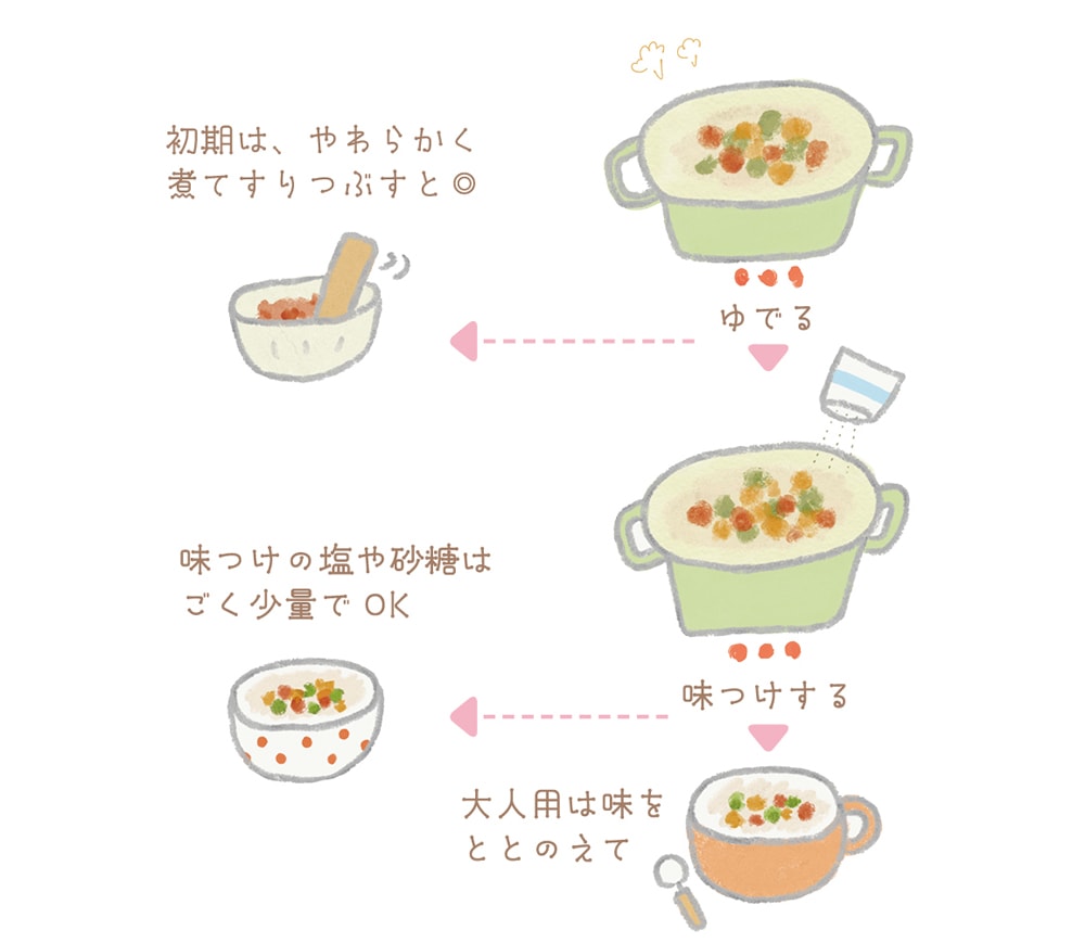 赤ちゃんは月齢によって食べられる食材が限られるものの、できるだけ大人と同じ食材や味を体験させてあげるとよいでしょう。おすすめは、大人ごはんを作る過程で赤ちゃんの分を分ける「取り分け離乳食」。特に、赤ちゃんの月齢に合わせて調理しやすいおかゆやスープは、体を温めて消化によく、食材や味のバリエーションが出しやすいです。